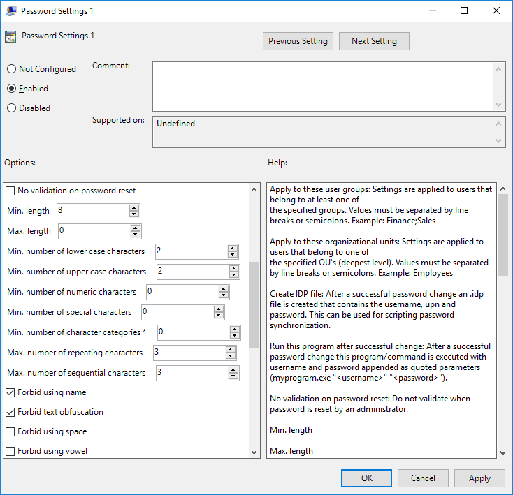 ActivePasswords gives administrators full control over password complexity rules. All settings are centrally managed and can be applied flexibly per security group or organizational unit. Available options include: