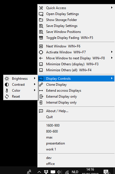 > Press `ALT` + `SPACE` to open the application menuWS Display Settings is a utility to save and apply Windows display settings (monitor positioning, resolution, refresh rate, display extension mode) to and from file as well as adjust the monitor brightness/contrast/colour settings itself. It can also save and restore the window arrangement across displays (position, size and state) and has handy window management features. Finally it can save and load common desktop icon file types and its desktop layout so you can arrange and restore your desktop icons with the click of a button.